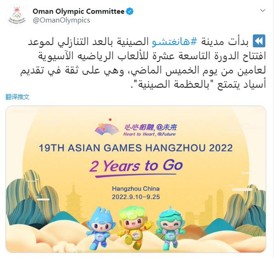 The 19th Asian Games will take place in Hangzhou, capital of Zhejiang province in eastern China, from September 10-25, 2022. On the occasion of two years to go to the opening ceremony on September 10, Asia's 45 NOCs were asked to share in the celebration and proudly display the special logo.