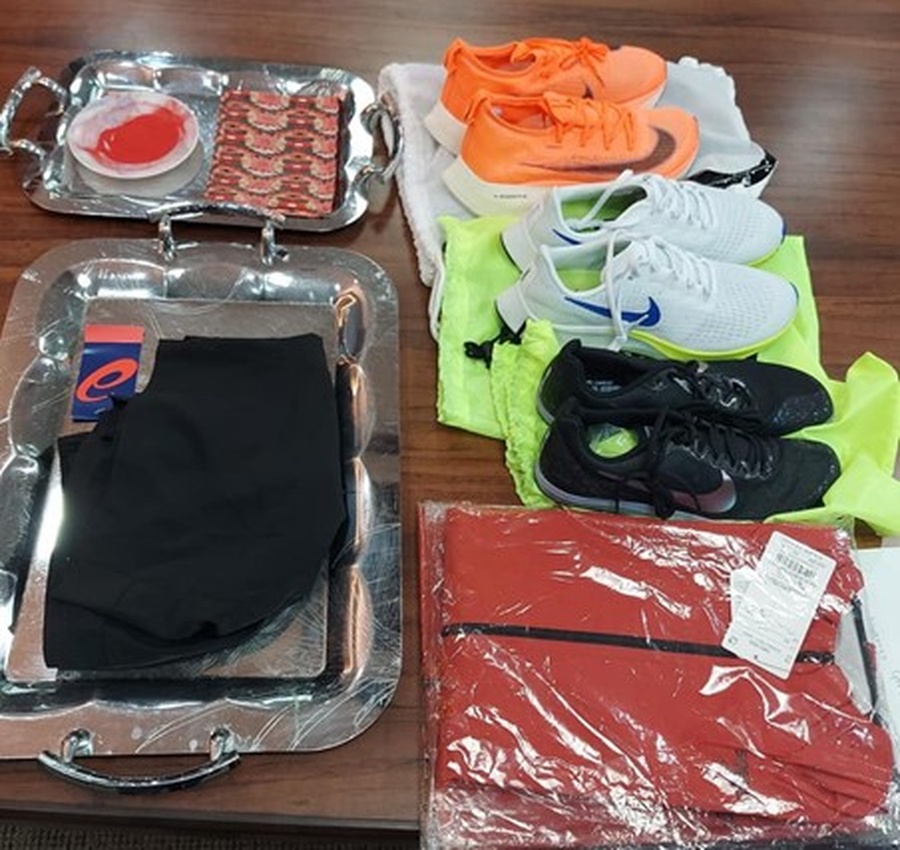 Kathmandu, Nepal, March 27, 2021: The President of Nepal Olympic Committee, Hon. Jeevan Ram Shrestha, has on behalf of the NOC presented marathon runner Gopichandra Parki with running equipment as he prepares for the Tokyo Olympics.