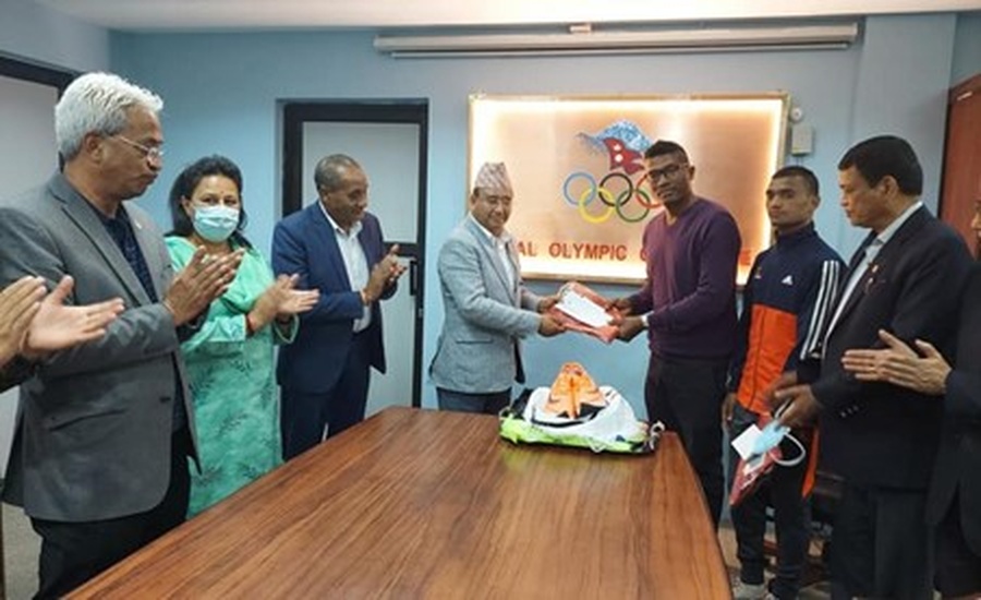 After presenting Parki with training shoes, spikes and running shoes, President Shrestha said: “He must aim to break the South Asian Games record held by Baikuntha Manandhar. Our best wishes to Gopichandra Parki and coach Santosh Shrestha.”