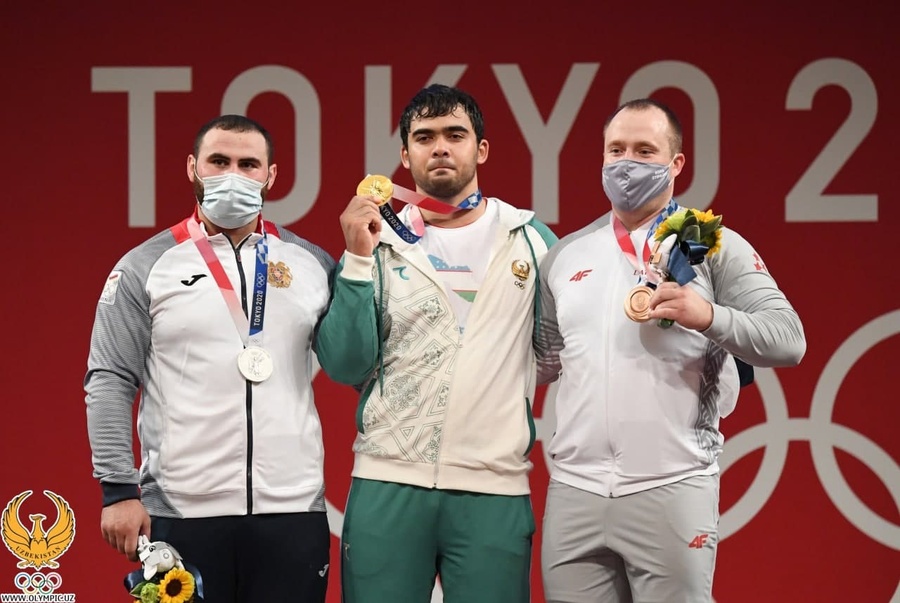 Tokyo, Japan, August 3, 2021: Akbar Djuraev won Uzbekistan its second gold medal at the Tokyo Olympics bringing home the men’s 109kg weightlifting title with an Olympic record of 430kg.
