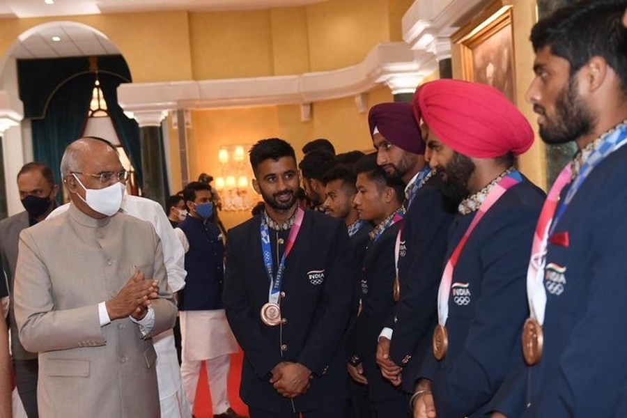 The Indian Tokyo Olympics contingent took part in a group photograph with the President of India, Ram Nath Kovind, with captain of the bronze medal-winning men’s hockey team Manpreet Singh tweeting: “A Big thank you to Honourable President of India Ram Nath Kovind sir for inviting and hosting all of us over a High Tea at Rashtrapati Bhavan Cultural Centre.”