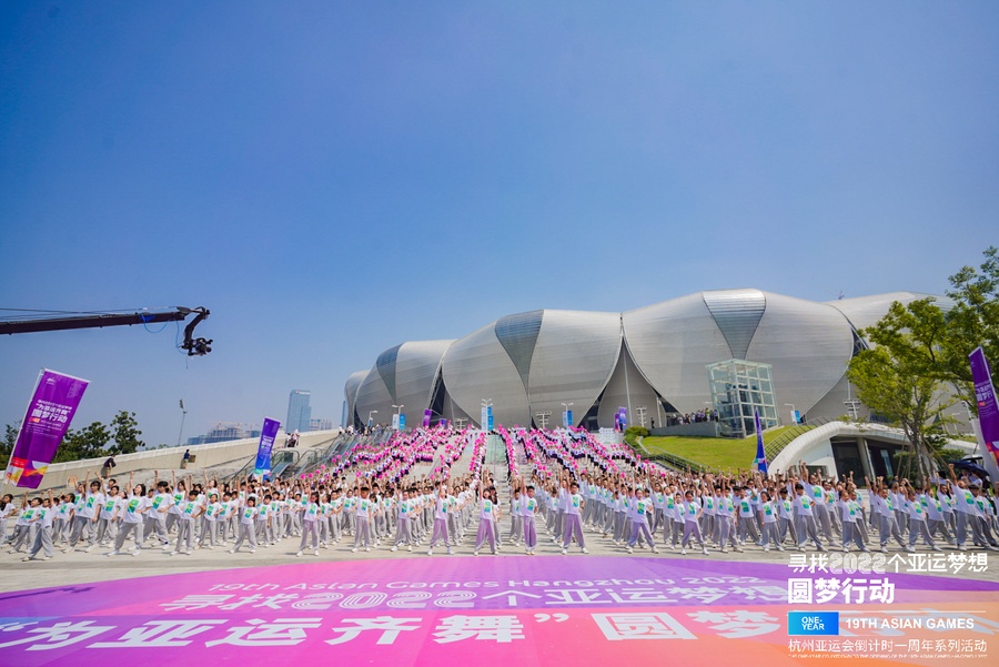 The one-year countdown celebration last September also involved wide participation from the community, with 3,000 primary and middle school children and dancers taking part in two shows - Painting Asian Games Dreams and Dancing for Hangzhou 2022 - in front of the Hangzhou Olympic Sports Centre Stadium on the banks of the Qiantang River.