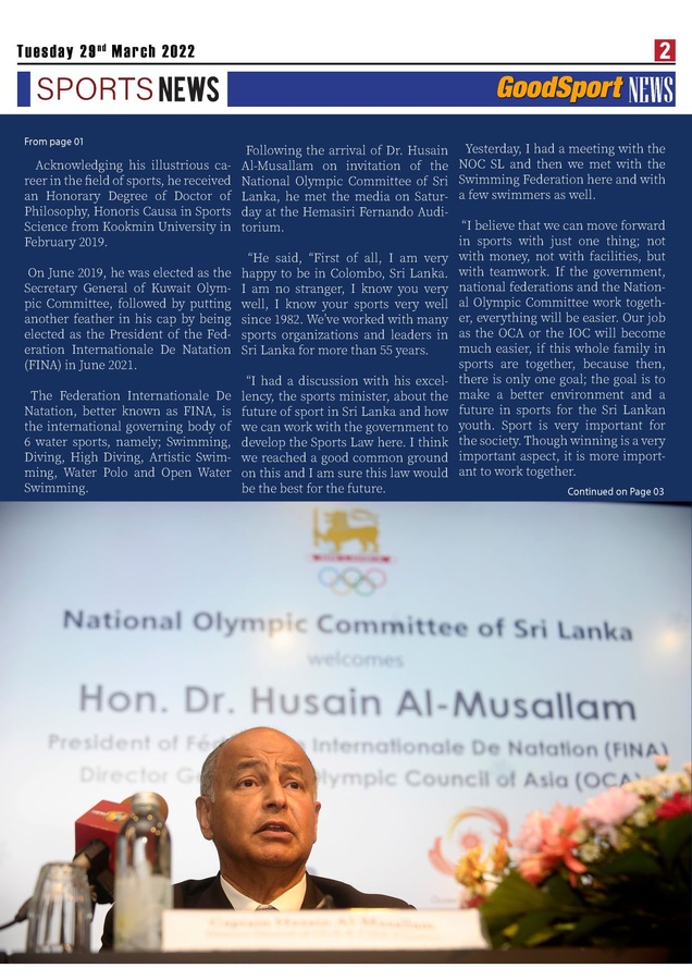 Colombo, Sri Lanka, April 4, 2022: The 111th edition of GoodSport, the news bulletin of the National Olympic Committee of Sri Lanka, has welcomed the Director General of the Olympic Council of Asia, Mr. Husain Al Musallam, on its front cover.