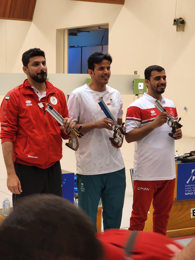 Kuwait City, Kuwait, May 17, 2022: Saudi border guard Atallah Al-Anazi was left shaking his head in disbelief after Emirati rival Ahmed Al-Ameeri gifted him the gold medal in the 10 metre Air Pistol Men’s competition at the 3rd GCC (Gulf Cooperation Council) Games Kuwait 2022 on Tuesday, May 17.