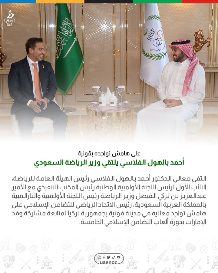 In a meeting on the sidelines of the 5th Islamic Solidarity Games in Konya, Turkey, HE Dr Ahmad Belhoul Al Falasi, Vice President of the United Arab Emirates NOC, met with HRH Prince Abdulaziz bin Turki Al-Faisal, President of the Saudi Olympic and Paralympic Committee, where a firm commitment was made to back the Saudi request for the Asian Winter Games.