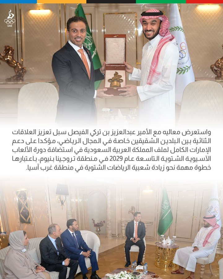 Both senior officials reviewed ways to strengthen bilateral sporting relations between the two countries. The UAE NOC Vice President then pledged the Emirates’ full support to Saudi Arabia’s wish to host the winter showpiece, especially as it would boost the development of winter sports in West Asia and the Middle East.