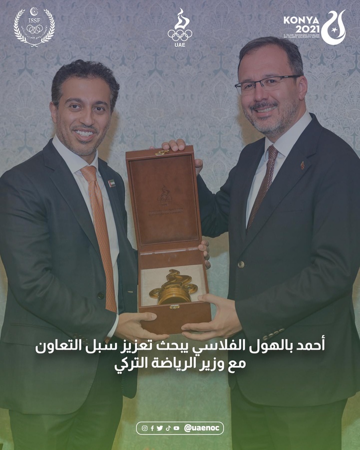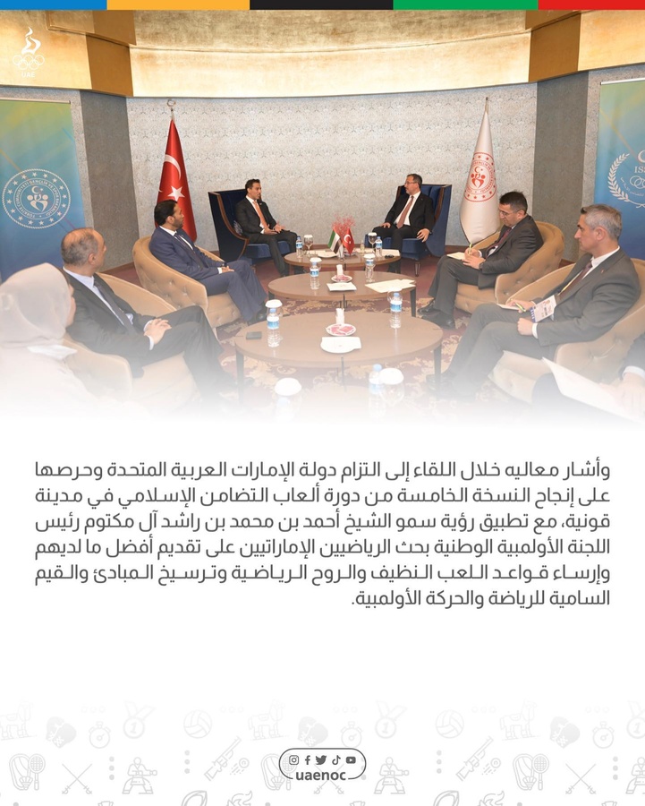 The meeting was also attended by Saeed Thani Hareb Al Dhaheri, UAE Ambassador to Turkey, Saeed Abdul Ghaffar Hussein, Secretary General of the General Body of Sports, and Engineer Azza Bint Suleiman, Assistant General Secretary for Administrative and Financial Affairs of the UAE NOC.