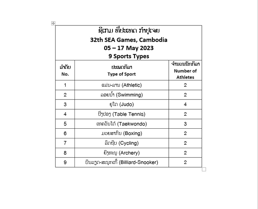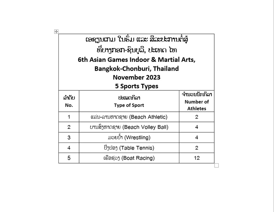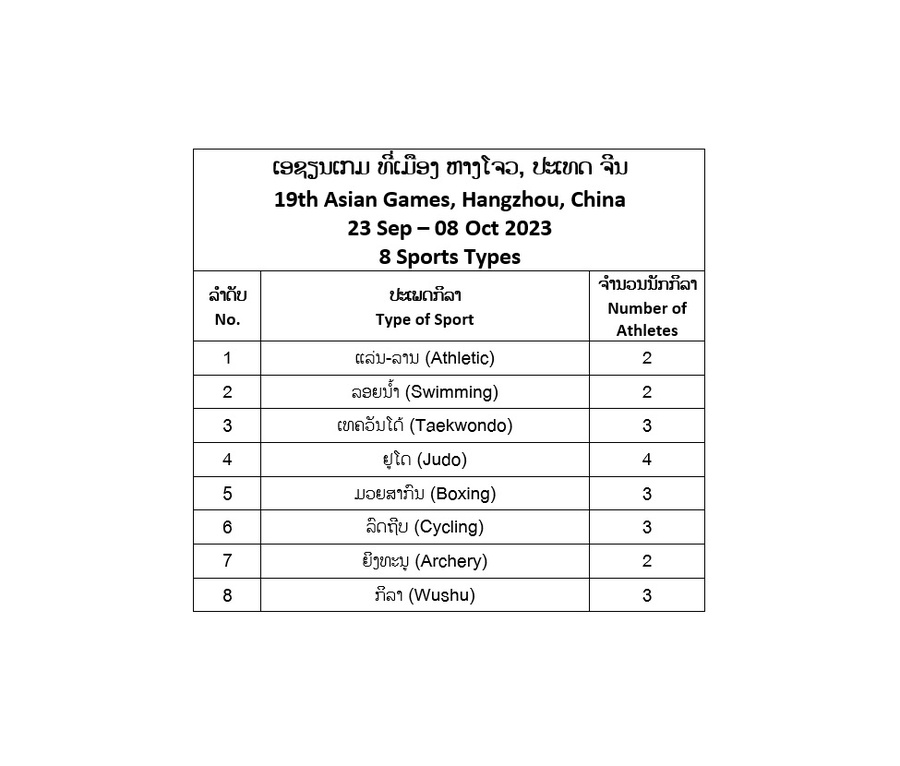 NOC Laos will send 21 athletes in nine sports to the 32nd SEA Games in Cambodia next May 5-17; 22 athletes in eight sports to the 19th Asian Games in Hangzhou, China from September 23 to October 8; and 24 athletes in five sports to the OCA’s 6th Asian Indoor and Martial Arts Games in Thailand next November 17-26, including 12 in boat racing.