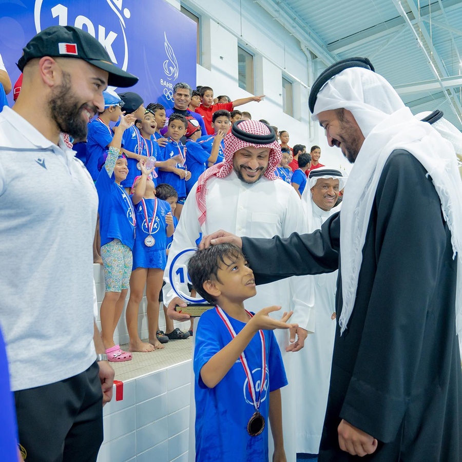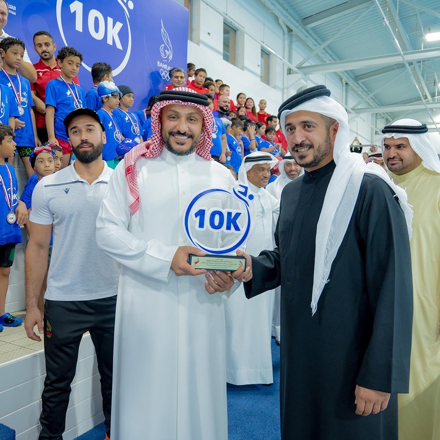 At the end of the event, the Bahrain Swimming Association expressed their gratitude for the support of His Highness Shaikh Khalid Bin Hamad Al Khalifa and presented him with a souvenir bearing the slogan of the initiative.