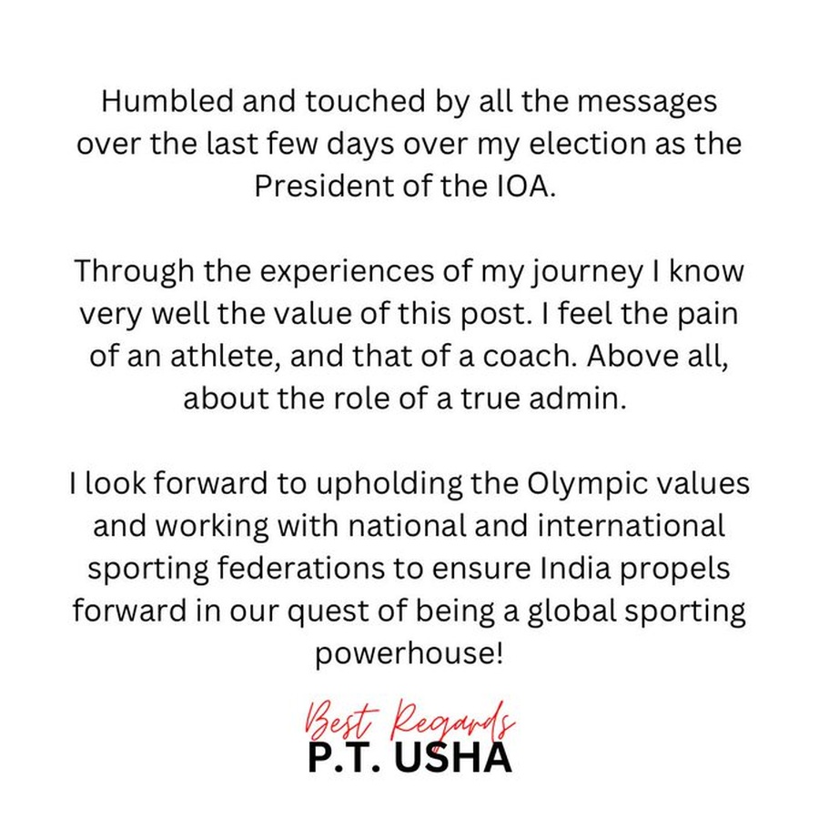 The legendary Indian sprint star wrote that she was “humbled and touched by all the messages over the last few days over my election as the President of the IOA.”