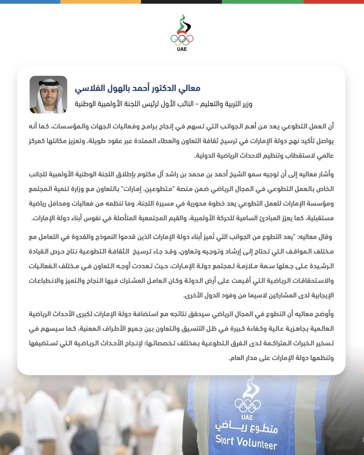 HE Dr. Ahmad Belhoul Al Falasi, First Vice President of the UAE NOC, said: “Volunteering is one of the aspects that distinguish the people of the UAE. Volunteers are role models who impart positive impressions of our country to people from other countries.”