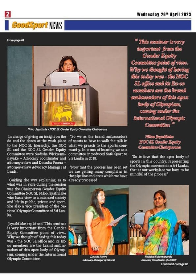 The Chair of the Gender Equity Committee and Vice President of the Sri Lanka NOC, Niloo Jayatilaka, who disclosed that Safe Sport in Sri Lanka had been introduced by the NOC in 2018, spelled out the rights of athletes and explained the reason for holding the seminar.