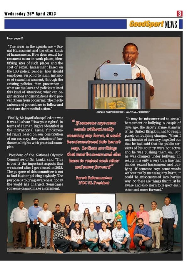 Colombo, Sri Lanka, April 27, 2023: The Gender Equity Committee of the National Olympic Committee of Sri Lanka held a workplace harassment seminar on Tuesday, April 25.