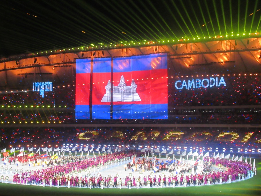 The parade of nations was led by Brunei Darussalam, followed by Indonesia, Laos, Malaysia, Myanmar, Philippines, Singapore, Thailand, Timor Leste and Vietnam. These 10 countries had been restricted to 50 marching delegates only – and the excitement and anticipation built to a crescendo before the host nation entered the arena with a huge, purple-clad contingent to create a deafening roar.