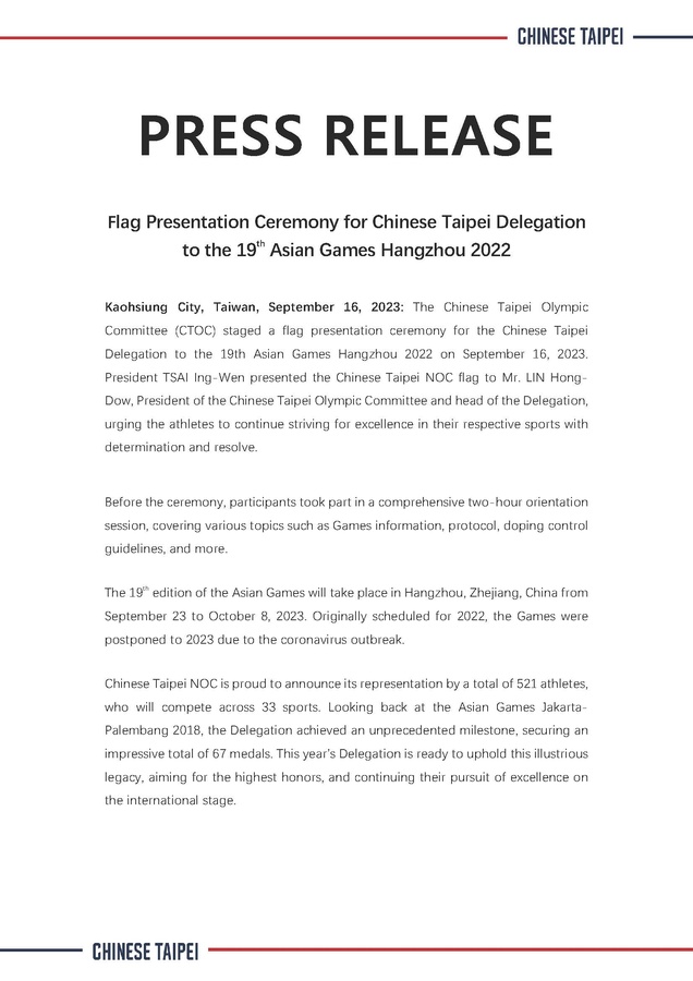 Kaohsiung City, September 16, 2023: The Chinese Taipei Olympic Committee (CTOC) staged a flag presentation ceremony for the Chinese Taipei delegation to the 19th Asian Games Hangzhou 2022 on September 16, 2023.