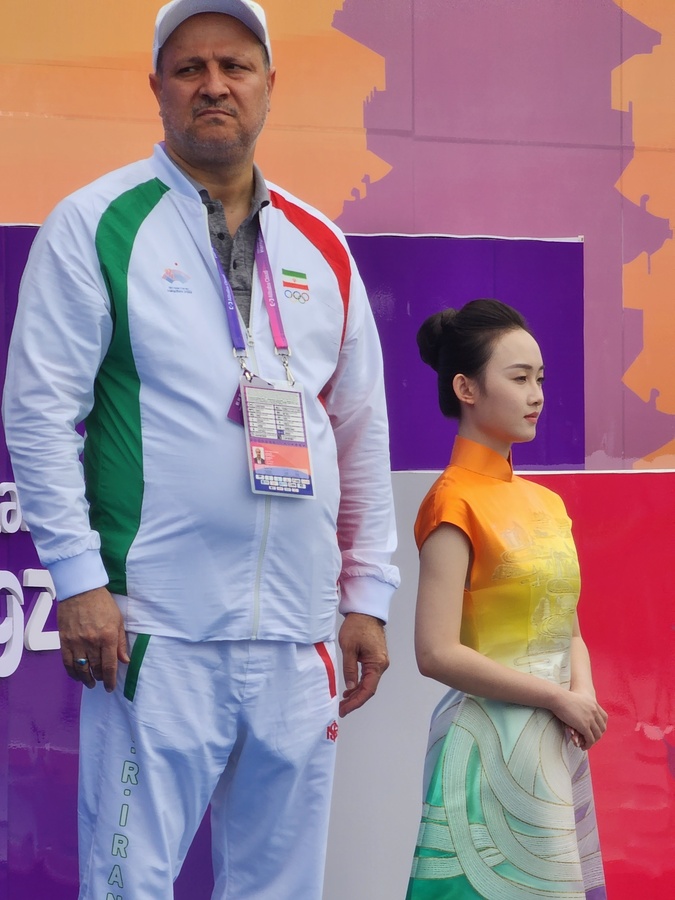 Hangzhou, China, September 20, 2023: Iran team leader Seyed Manaf Hashemi is the number one cheerleader as the country’s volleyball legend, Seyed Mohammad Mousavi, goes for gold at the 19th Asian Games in Hangzhou.