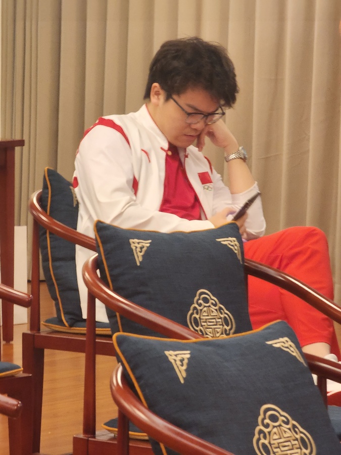 Black starts first, in this case Hsu. And he looked a picture of confidence as he hardly paused in making his moves. On the opposite end sat a fidgety Ke, first removing his China Team windbreaker and then getting up to go and get a bottle of water. His opponent had brought his own to the table before the battle began, showing he was prepared, a true-blue boy scout.