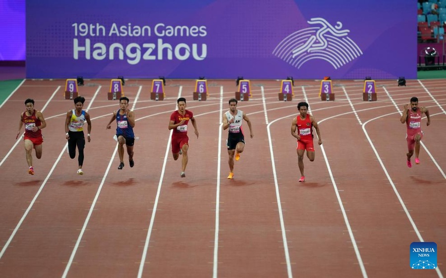 Hangzhou, China, September 30, 2023: China’s Xie Zhenye won the tag of fastest man in Asia going sub-10 seconds on a night of high drama in athletics at the Hangzhou Asian Games, where pre-race favourite Femi Ogunode of Qatar failed to qualify for the blue riband men’s 100 metres event.