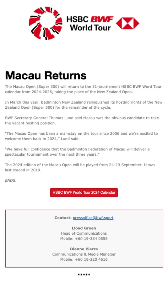 The Macau Open (Super 300) will return to the 31-tournament HSBC BWF Word Tour calendar from 2024-2026, taking the place of the New Zealand Open.