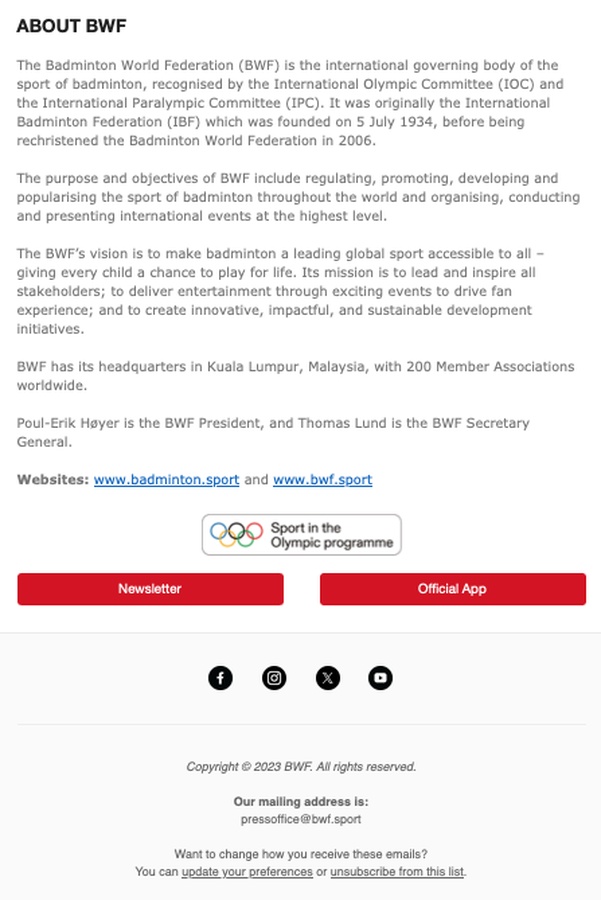 Lund added that the allocation of World Ranking points for the HSBC BWF World Tour Finals, BWF World Championships, and Olympic Games had also increased.