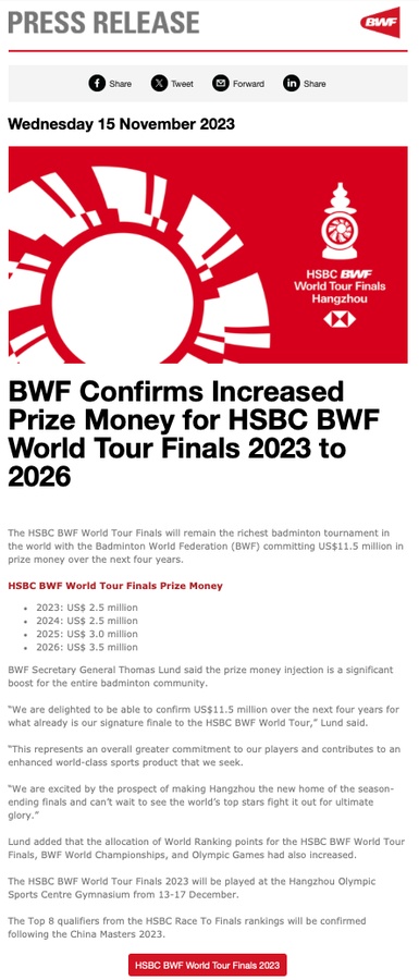 BWF Secretary General Thomas Lund said the prize money injection was a significant boost for the entire badminton community.