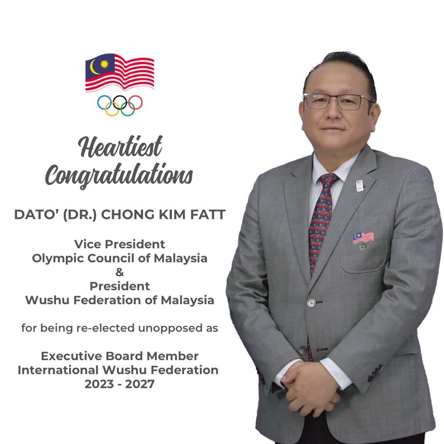 Kuala Lumpur, Malaysia, November 26, 2023: The Olympic Council of Malaysia has congratulated Dato’ (Dr.) Chong Kim Fatt, Vice President of the OCM and President of the Wushu Federation of Malaysia, for his unopposed re-election as an Executive Board member of the International Wushu Federation for the term 2023-2027.