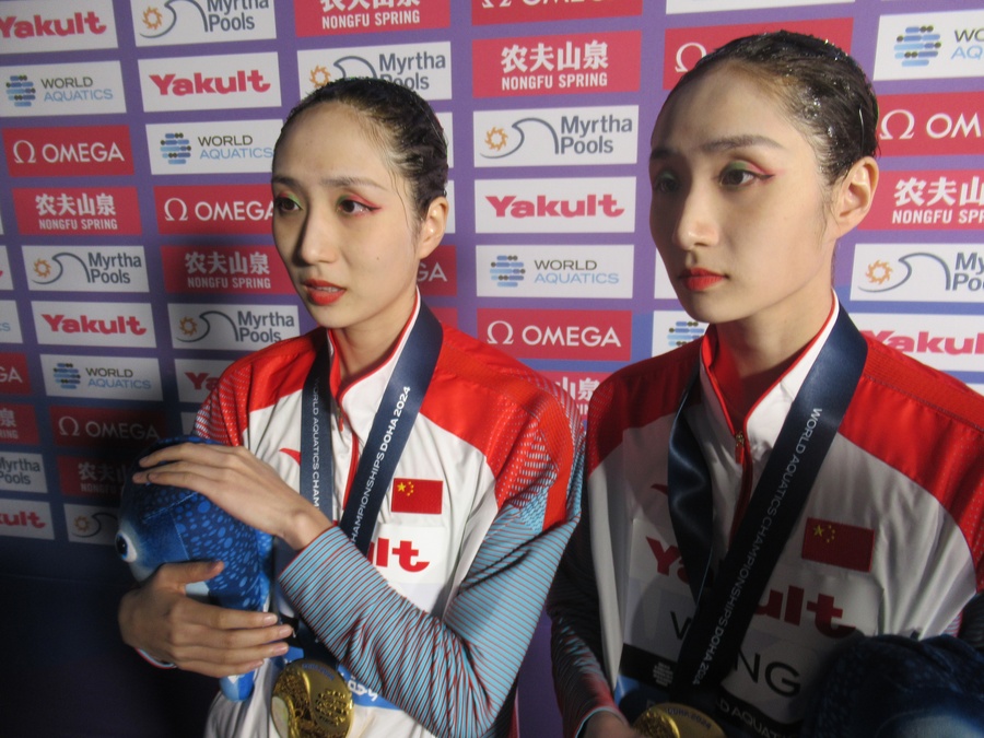 Doha, Qatar, February 5, 2024: Chinese twins Wang Liuyi and Wang Qianyi kept their nerve as the last pair to go in the women’s duet technical final – and won World Aquatics Championships gold in Doha on Monday in artistic swimming.