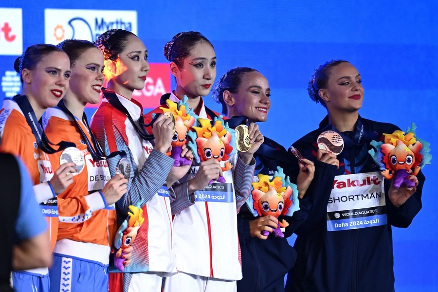 Doha, Qatar, February 8, 2024: Chinese twins Wang Liuyi and Wang Qianyi completed a golden grand slam in artistic swimming at the World Aquatics Championships – Doha 2024 on Thursday.