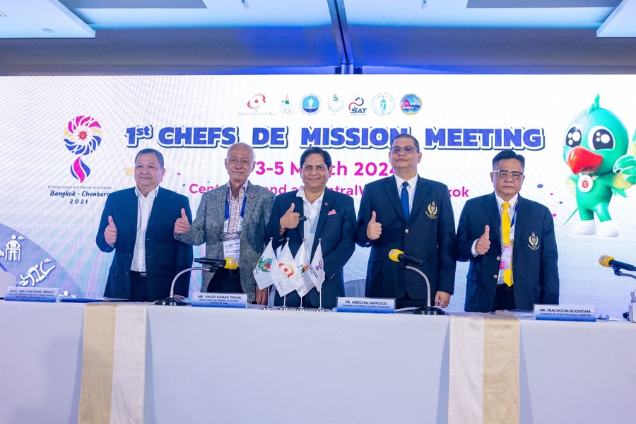 Bangkok, Thailand, March 5, 2024: Dato Seri Chaiyapak Siriwat, OCA Vice President and Vice President of Thailand NOC, assured delegates at the 1st Chefs de Mission Meeting that empty halls and unadorned indoor stadiums would be transformed into fully-fledged facilities for the 6th Asian Indoor and Martial Arts Games in November.