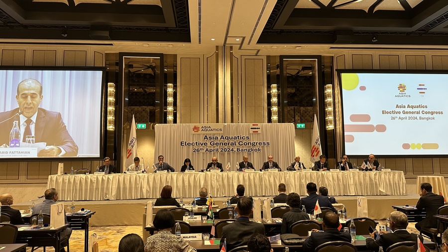 Bangkok, Thailand, April 28, 2024: Sheikh Khalid B. Al Sabah of Kuwait was re-elected President of Asia Aquatics for a third term at the 16th Elective General Assembly at the Eastin Hotel in Bangkok on Friday, April 26. The congress had been postponed four years due to the pandemic.