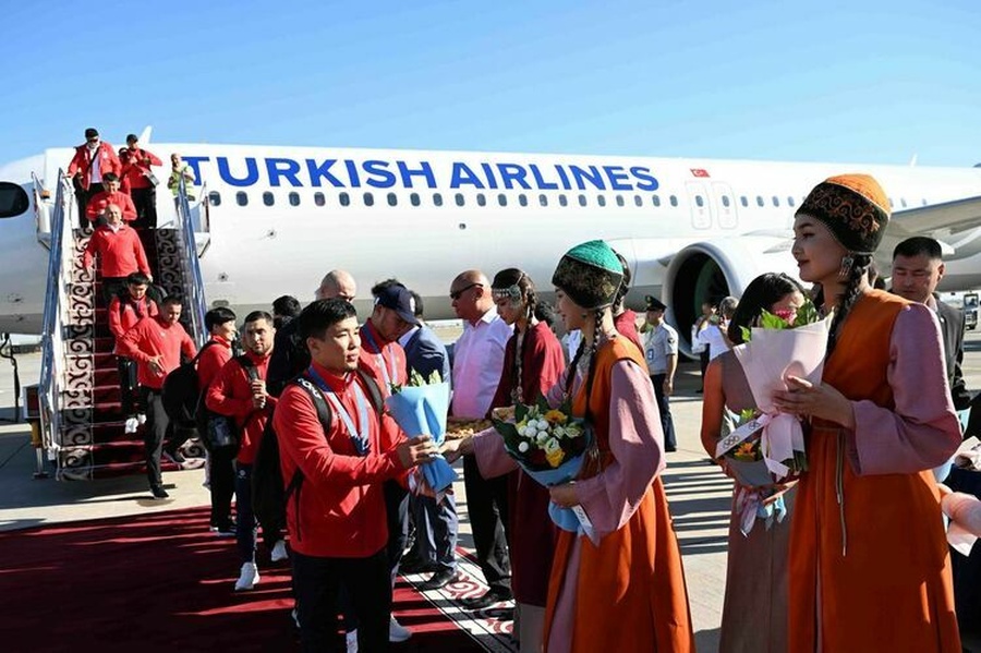 Bishkek, Kyrgyzstan, August 14, 2024: The Kyrgyzstan delegation that participated at the Paris Olympics returned home to a grand welcome in Bishkek which ended with the keys to brand new cars being presented to medal winners.