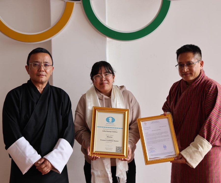 Thimphu, Bhutan, October 10, 2024: The Bhutan Olympic Committee felicitated three members of the Bhutan chess team who have been awarded the title of Candidate Masters by the International Chess Federation (FIDE).