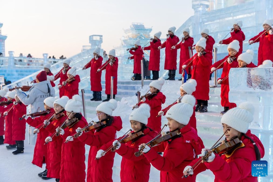 The performance certainly caught the attention of tourists from near and far, not only with the sound of violins but also the dash of colour amidst the white winter wonderland of the Harbin Ice and Snow World.