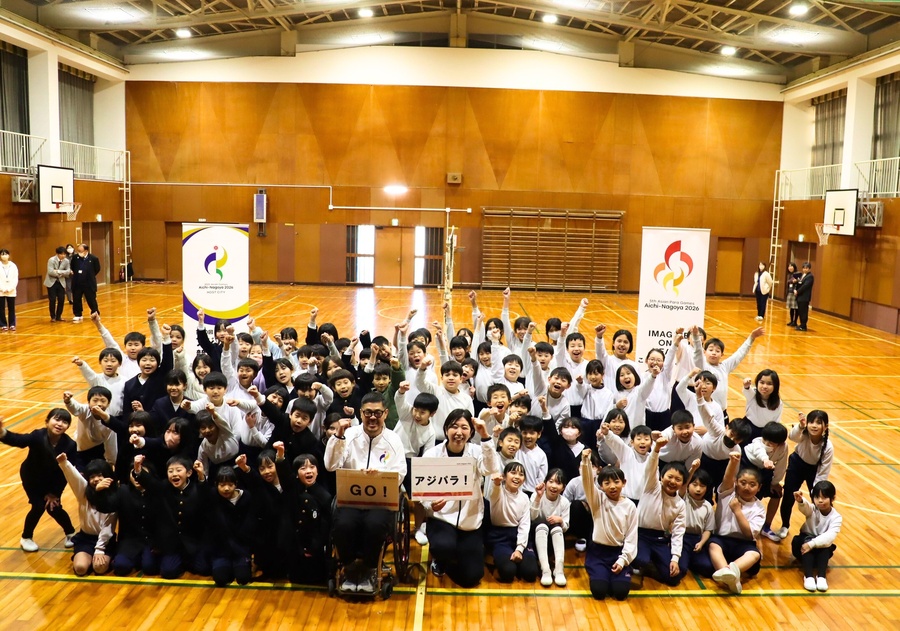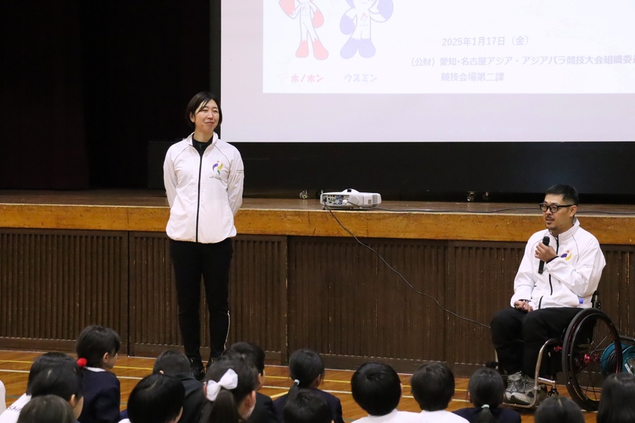 Two representatives from the Athletes Committee called in at Isshiki Nanbu Elementary School in Nishio City to talk about the 20th Asian Games and 5th Asian Para Games in 2026 and play their respective sports with the students.