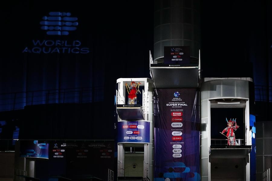 Beijing, China, May 5, 2025: A captivating performance of Peking Opera staged on the diving platform amazed the audience during the World Aquatics Diving World Cup Super Final at the National Aquatics Center, famously known as the "Water Cube," in Beijing on Saturday, Xinhua News reports.