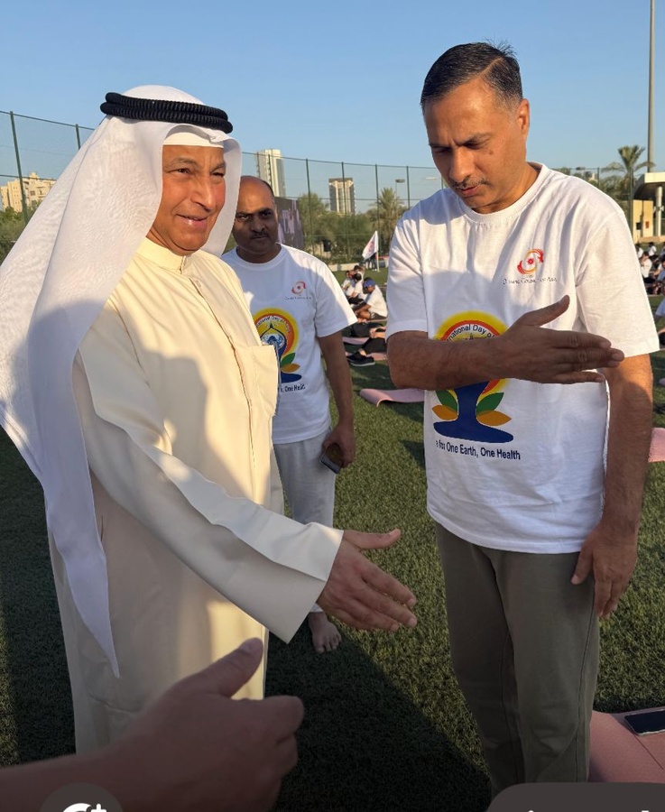 The Indian Ambassador to Kuwait, Dr. Adarsh Swaika, and the Counsellor to the Prime Minister of India for yoga, Guruji Dr. H.R. Nagendra, greeted Captain Husain before the mass participation yoga event began.