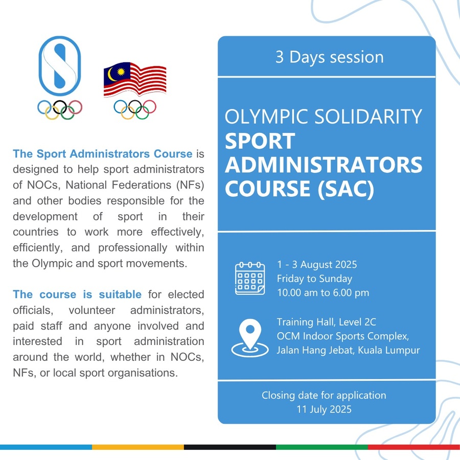 The Olympic Solidarity-funded course will be held from August 1-3, 2025 at the OCM Indoor Sports Complex, Jalan Hang Jebat, Kuala Lumpur.