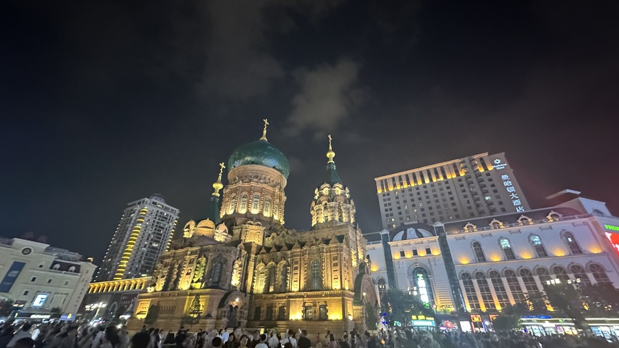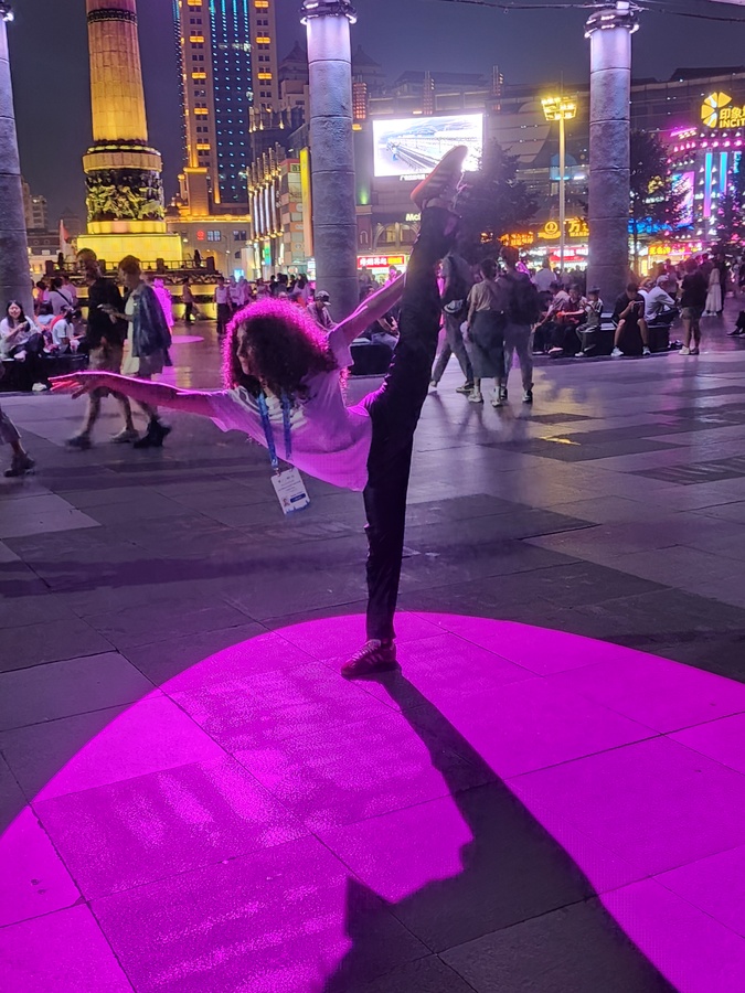 Harbin, China, August 12, 2025: Zhasmin Shlaga literally let her hair down when she posed in silhouette for a photo in the spotlights along Central Street in Harbin on Tuesday evening, August 12.