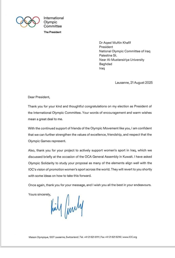 Baghdad, Iraq, August 31, 2025: The President of the National Olympic Committee of Iraq, Dr. Aqeel Muften, has received a letter from International Olympic Committee President Kirsty Coventry acknowledging the congratulations from the Iraqi NOC on her election to the top IOC post.